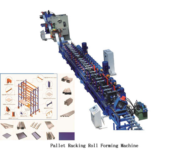 Pallet racking (Upright) roll forming line includes de-coiler, leveler, feeding device, punching, roll forming, cutting, and run-out. It adopts Siemens PLC, touch screen input, high degree of automation, convenient operation, high production efficiency, and the whole line production speed can reach 40m/min.